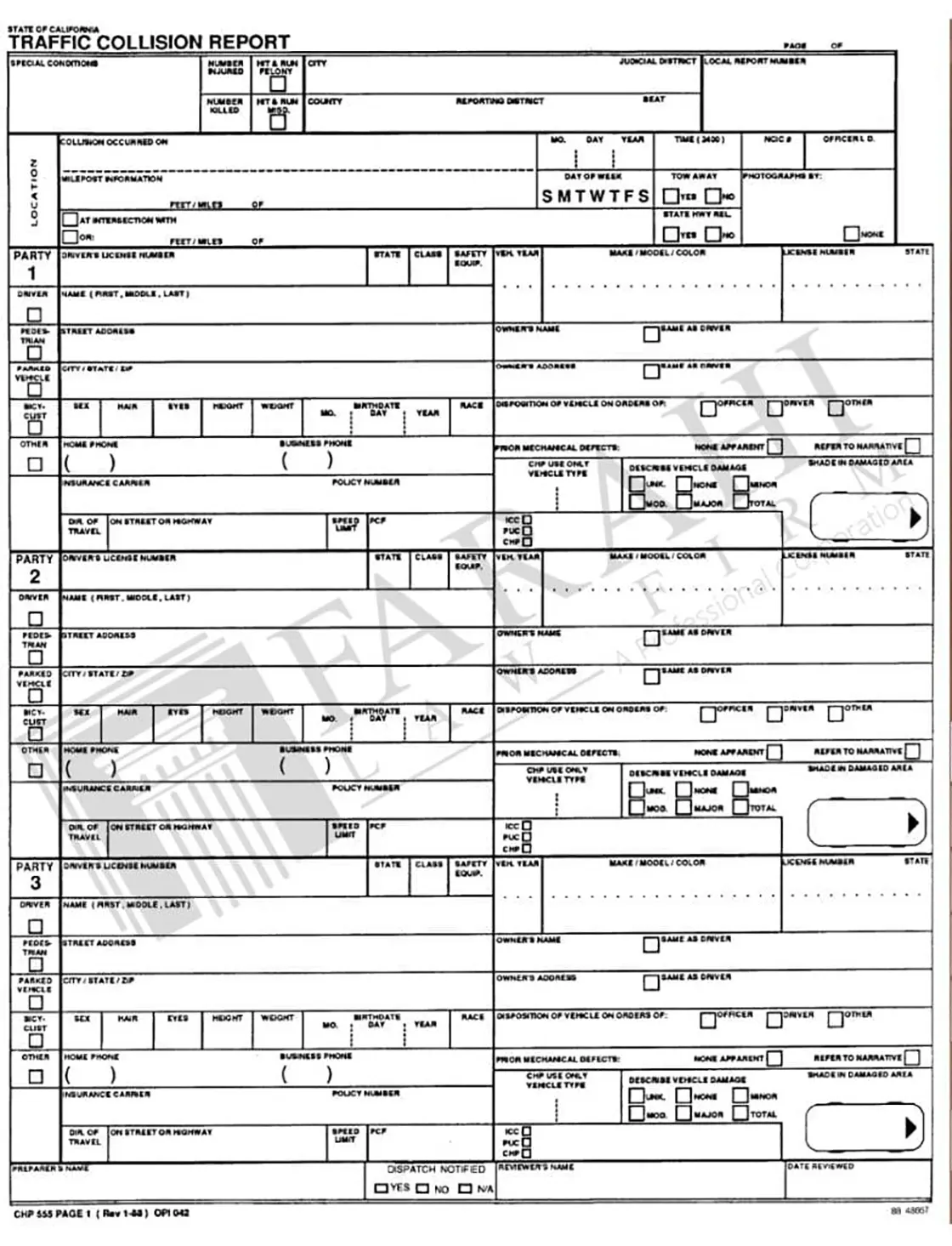 The CHP 555, as the car accident report is known, is a document filed by the police to report on the traffic collision. The form includes: