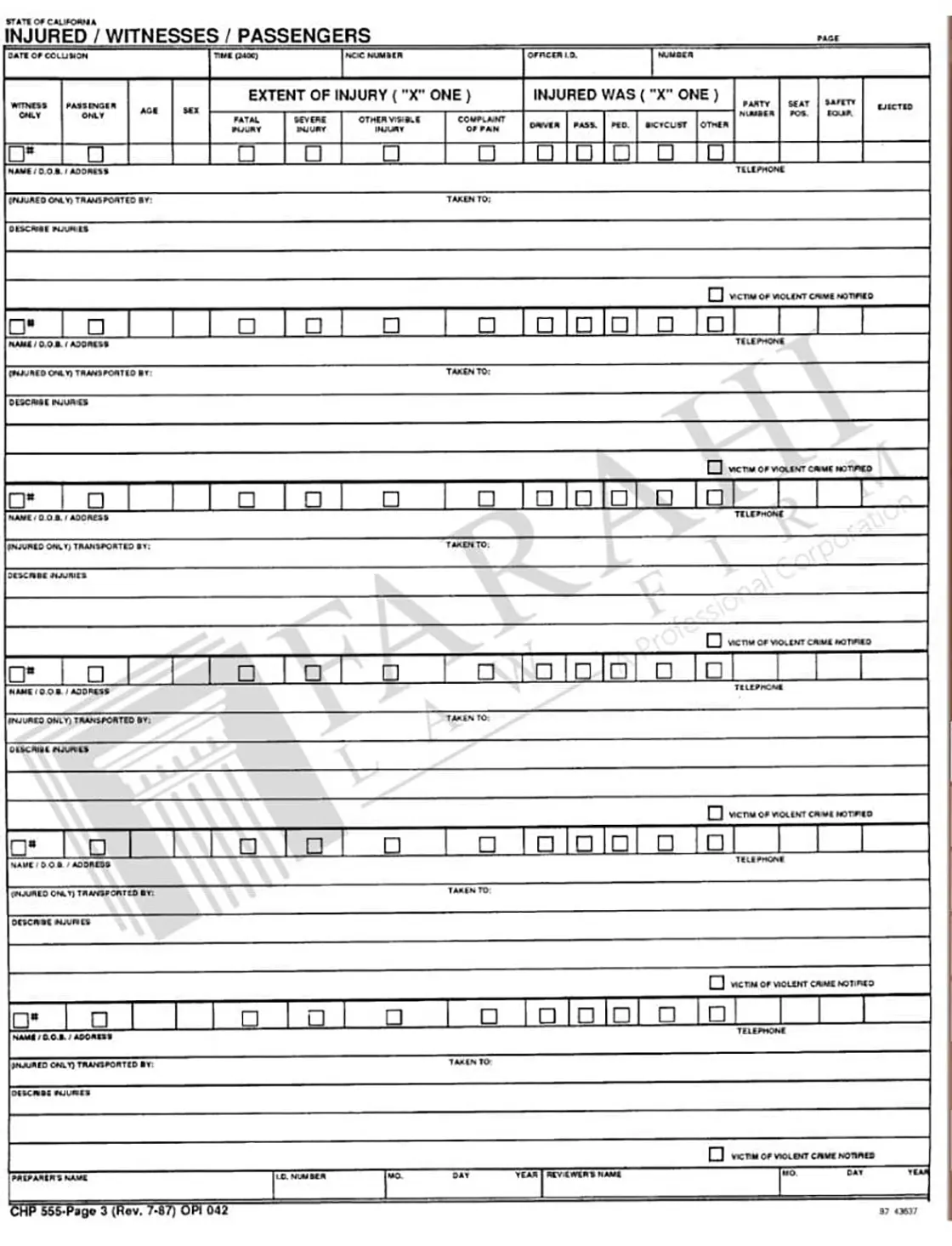 The third page of the report gives us a description of the injured parties, passengers, and witnesses of the accident. As with previous pages, the top section should be uniform across the whole document.